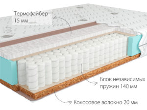 Высота матраса 21 см Жесткость (верх) Средне-жёсткий 4H Жесткость (низ) Мягкий 3H Макс. нагрузка на спальное место до 100 кг Основа матраса Блок независимых пружин Medio, высота 140 мм Количество пружин на спальное место 520 шт. Настил матраса (верхняя сторона) Кокосовое волокно 10 мм, Латексная плита 30 мм Настил матраса (нижняя сторона) Латексная плита 20 мм Ткань матрасного чехла трикотажная, жаккардовая Срок гарантии 36 месяцев Срок службы 10 лет