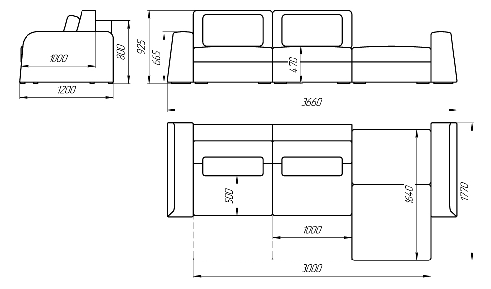 Габаритные размеры: 366 см x 120 см x 92.5 см