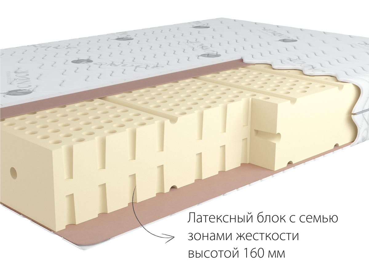 Высота матраса 17 см Жесткость (верх) Средне-жёсткий 4H Жесткость (низ) Средне-жёсткий 4H Макс. нагрузка на спальное место до 130 кг Основа матраса латексный блок, высота 160 мм Количество зон жесткости 7 Ткань матрасного чехла трикотажная, жаккардовая Срок гарантии 36 месяцев Срок службы 10 лет