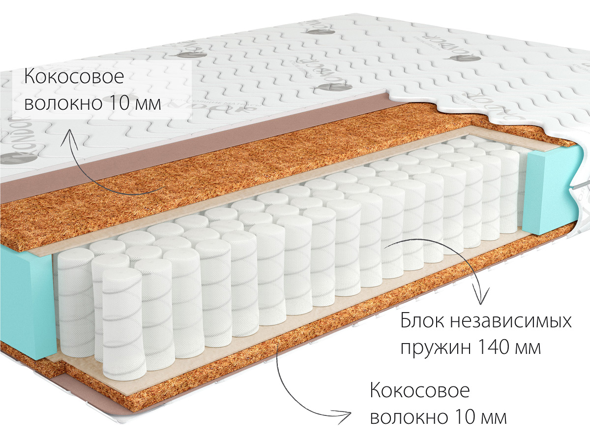Высота матраса 17 см Жесткость (верх) Средне-жёсткий 6H Жесткость (низ) Средне-жёсткий 6H Макс. нагрузка на спальное место до 120 кг Основа матраса Блок независимых пружин Hard, высота 140 мм Количество пружин на спальное место 600 шт. Настил матраса (верхняя сторона) Кокосовое волокно 10 мм Настил матраса (нижняя сторона) Кокосовое волокно 10 мм Ткань матрасного чехла трикотажная, жаккардовая Срок гарантии 36 месяцев Срок службы 10 лет