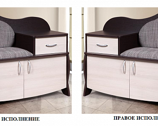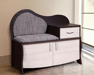 Материал:каркас/фасад – ламинированная ДСП; кромка — ПВХ 0,45÷2мм; сиденье/спинка — поролон, ткань; ручки – металл