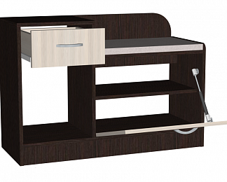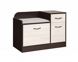 Материал:каркас/фасад – ламинированная ДСП; кромка — ПВХ 0,45÷1мм; сиденье — поролон, ткань; ручки — металл