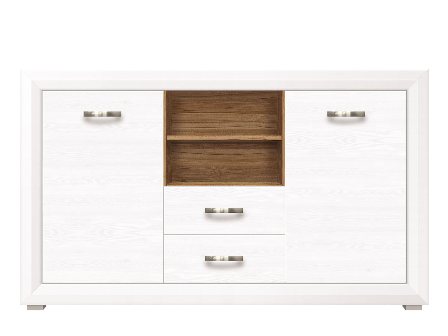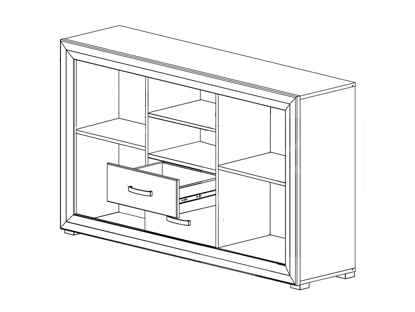- 2 распашные глухие двери, за которыми расположено 4 отделения, 2 выдвижных ящика и открытые ниши.