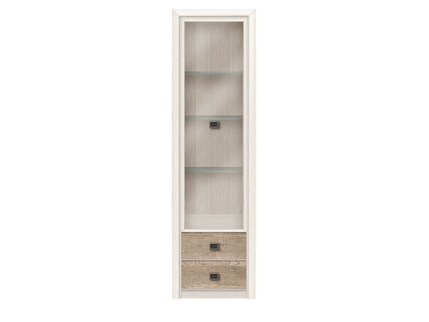 - Шкаф имеет одно вертикальное отделение с тремя вкладными стеклянными полками и отделением с двумя выдвижными ящиками;