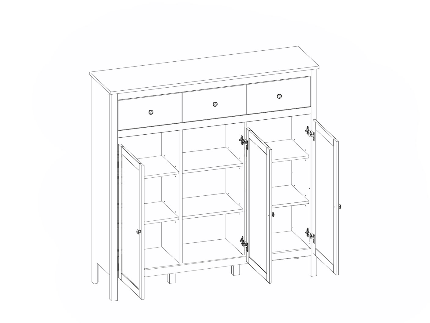 - В нижней части 3 отделения с полками за распашными глухими дверями;