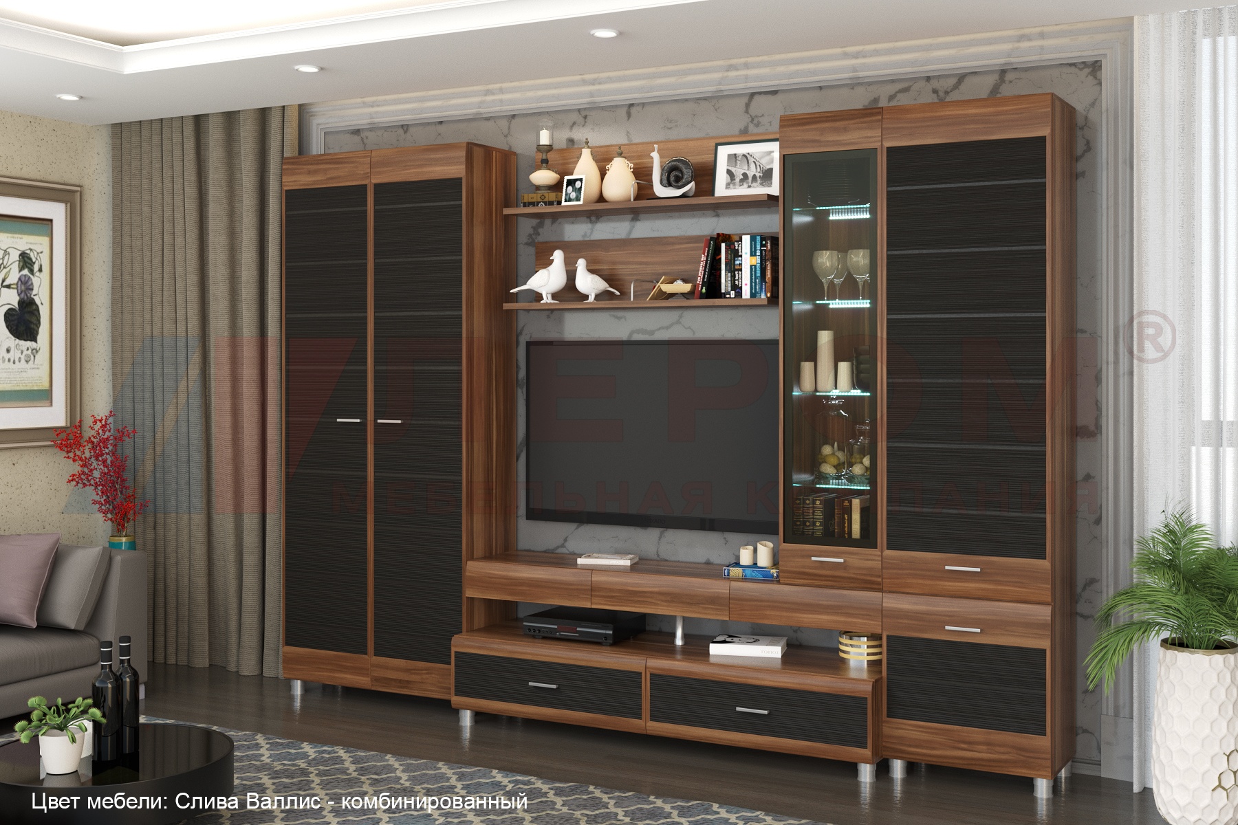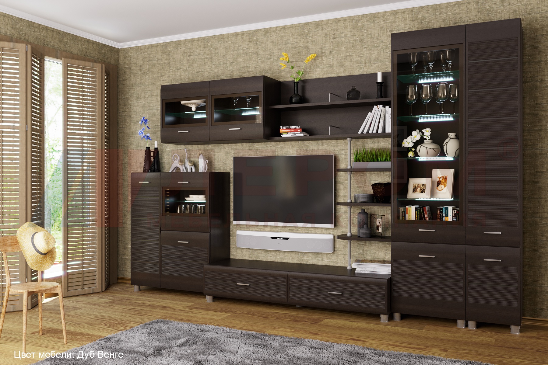 Корпусная мебель для гостиной «Камелия» — это модульная мебель. Она состоит из 42 модулей, с помощью которых можно составить огромное множество вариантов готовых композиций. Фасады с комбинированными вставками имитируют специальную технологию «браширования». Мебель изготавливается из высококачественных материалов: ЛДСП, МДФ (фасад), стекло фасадов с оттенком «бронза».