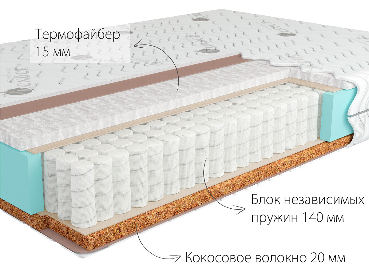 Высота матраса 18 см Жесткость (верх) Средне-жёсткий 4H Жесткость (низ) Жёсткий 8H Макс. нагрузка на спальное место до 120 кг Основа матраса Блок независимых пружин Medio, высота 140 мм Количество пружин на спальное место 520 шт. Настил матраса (верхняя сторона) Термофайбер 15 мм Настил матраса (нижняя сторона) Кокосовое волокно 20 мм Ткань матрасного чехла трикотажная, жаккардовая Срок гарантии 36 месяцев Срок службы 10 лет