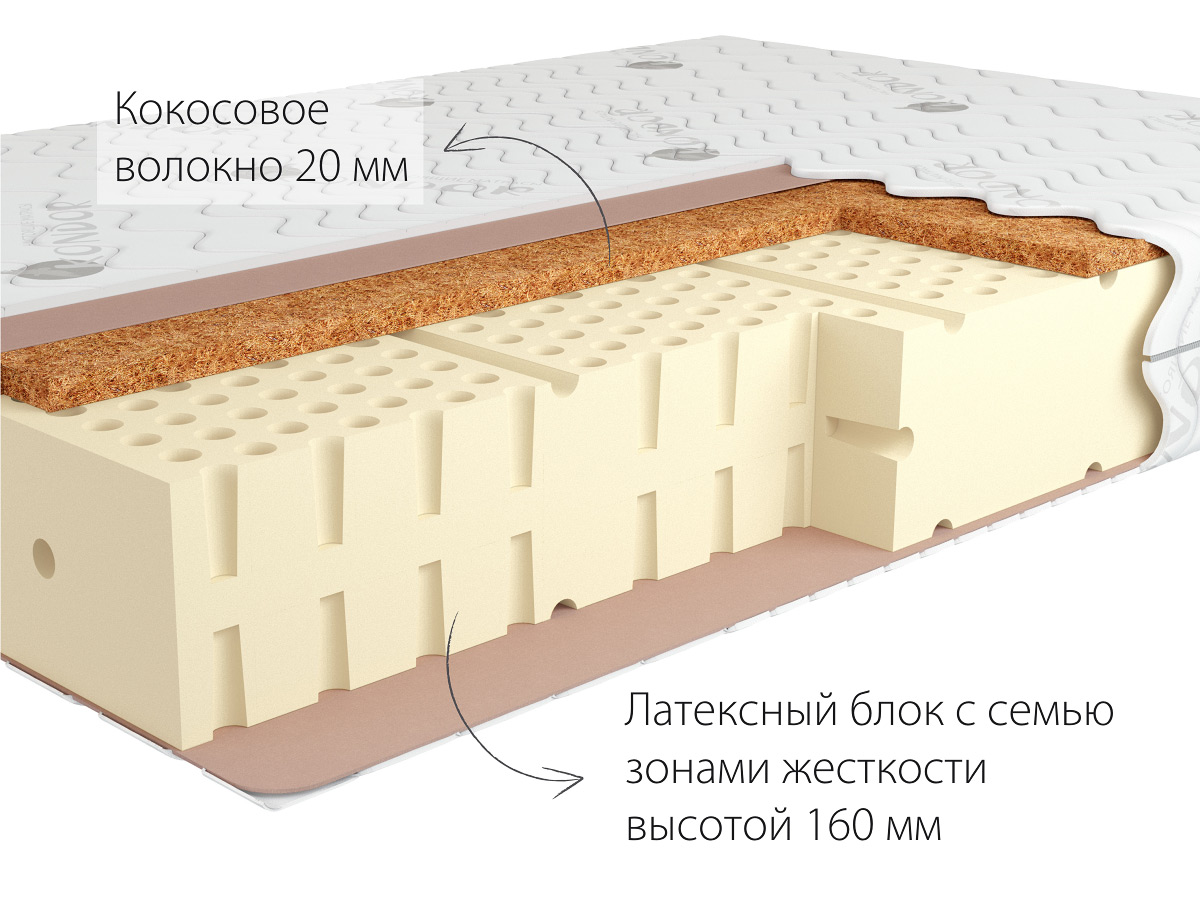 Высота матраса 19 см Жесткость (верх) Средне-жёсткий 7H Жесткость (низ) Средне-жёсткий 4H Макс. нагрузка на спальное место до 140 кг Основа матраса латексный блок, высота 160 мм Настил матраса (верхняя сторона) Кокосовое волокно 20 мм Количество зон жесткости 7 Ткань матрасного чехла трикотажная, жаккардовая Срок гарантии 36 месяцев Срок службы 10 лет