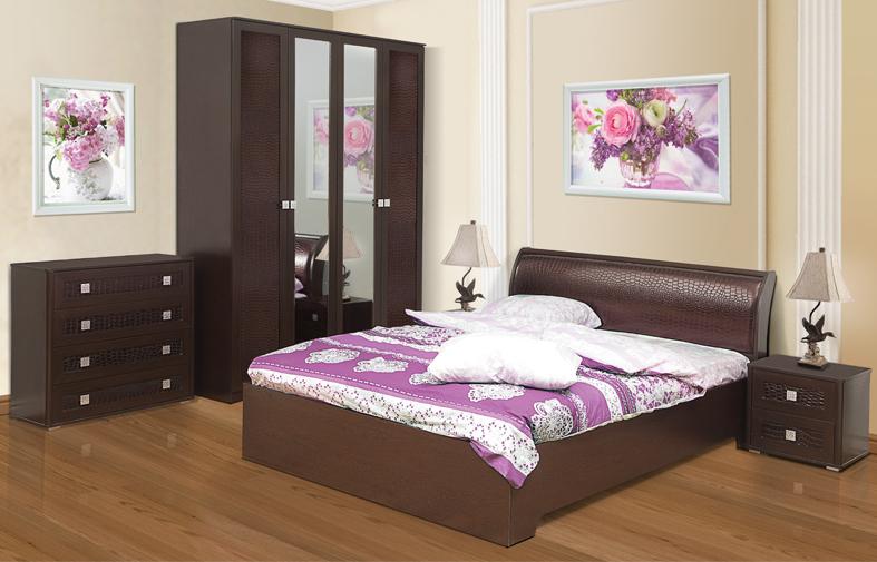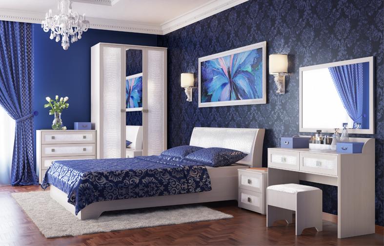 Мебельный гарнитур «Мона» – эстетичный комплект, способный украсить спальню и создать комфортные условия для отдыха. Набор включает вместительный шкаф с двумя отделениями и зеркалом по центру, двуспальную кровать с удобным изогнутым изголовьем, комод с четырьмя выдвижными ящиками, две прикроватные тумбы, туалетный столик и мягкий пуф. Светлая отделка, блестящая фурнитура, изящные формы обеспечивают мебели привлекательный внешний вид.