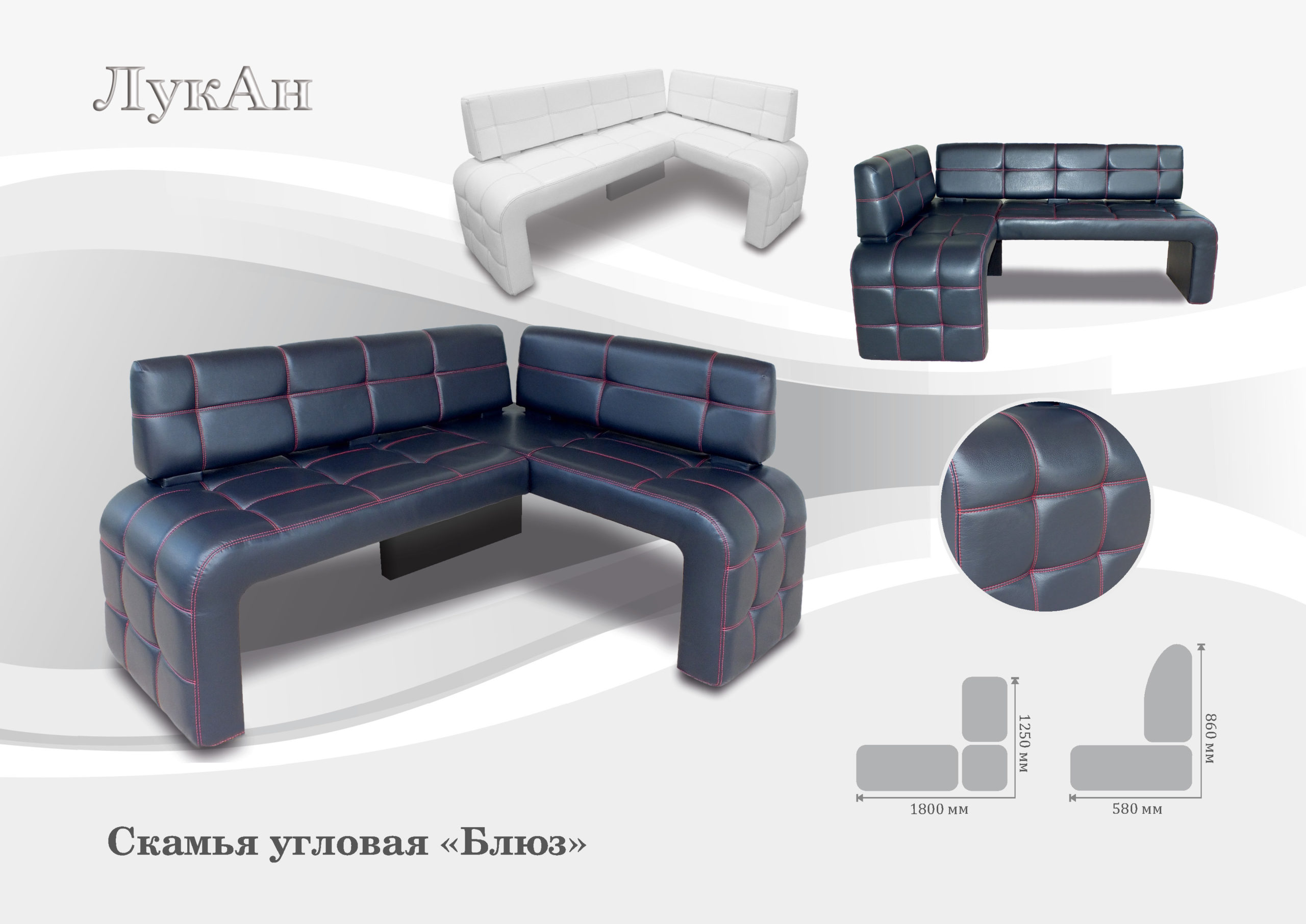 Благодаря современному дизайну и разнообразию обивочного материала наши угловые скамейки станут украшением любого интерьера и создадут на кухне эффект гостиной или столовой. Одна из таких – угловая скамья «Блюз». Данная угловая скамья может быть выполнена в правом или левом исполнении. Возможно изготовление задней стенки скамьи из основного обивочного материала. В стандартном исполнении используется техническая ткань (более бюджетный вариант). Возможен выбор цвета ниток декоративной отстрочки: в цвет обивки или контрастных. Без указания цвета ниток в заявке прошивка делается на усмотрение предприятия. Данная модель отличается оригинальной декоративной отстрочкой, что делает её стильной и современной. Угловая скамья «Блюз» по желанию прекрасно комплектуется со столами, табуретками, банкетками.