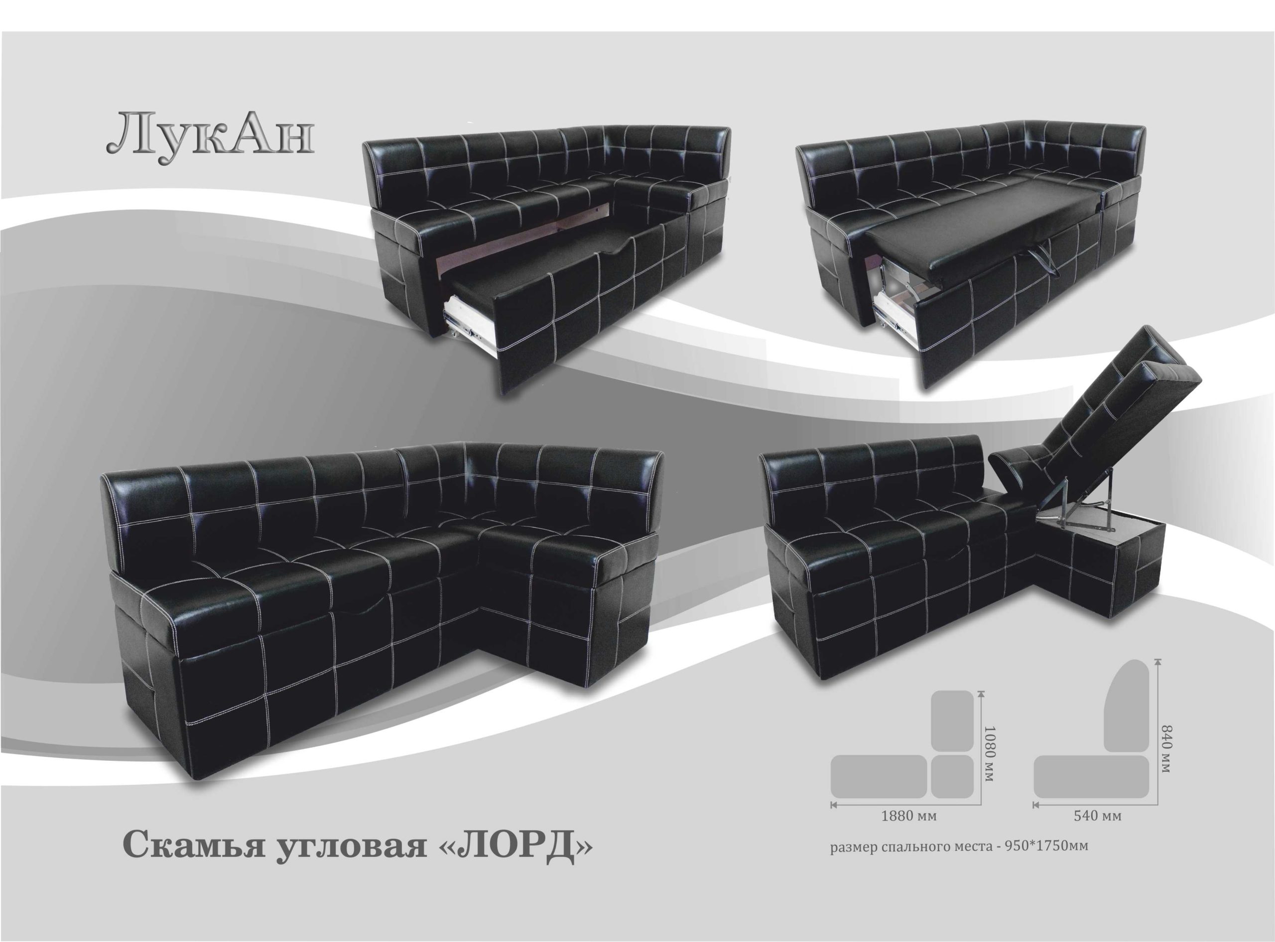 Угловые диванчики создадут на кухне эффект гостиной или столовой. А хорошим хозяевам никогда не помешает дополнительное спальное место, пусть даже и на кухне. Это неожиданное решение, которое может значительно упростить жизнь владельцам квартиры и их друзьям. В уголке скрывается спальное место, которое заменит кровать для задержавшихся допоздна гостей. Одна из таких наших моделей – скамья угловая «Лорд». Диван имеет механизм трансформации «дельфин», при помощи которого одно из сидений трансформируется в спальное место. Под вторым сиденьем расположен вместительный ящик для хранения. К данной модели возможно в комплект подобрать столы, табуреты, банкетки нашего производства. Конструктивные особенности модели позволяют выпускать скамьи разного размера с возможностью увеличения или уменьшения габаритов шагом в 10 см в любую сторону ( в рамках имеющегося размерного ряда). Глубина и высота дивана не меняются, как и ширина спального места. Длина спального места меняется пропорционально длине дивана. Рекомендуем длину дивана назначать не менее 180 см. Угловая скамья может быть выполнена в правом или левом исполнении. В стандартном варианте выкатная секция обивается тем же обивочным материалом, что и сиденья основных секций. По желанию заказчика эта секция может быть облицована подкладочной тканью. Возможно изготовление задней стенки скамьи из основного обивочного материала. В стандартном исполнении используется техническая ткань (более бюджетный вариант). Эта модель отличается оригинальной декоративной отстрочкой .Возможен выбор цвета ниток декоративной отстрочки: в цвет обивки или контрастных. Без указания цвета ниток в заявке прошивка делается на усмотрение предприятия. Данная модель скамьи со спальным местом является «гостевым вариантом» и не предназначена для использования в качестве кровати для ежедневного сна.