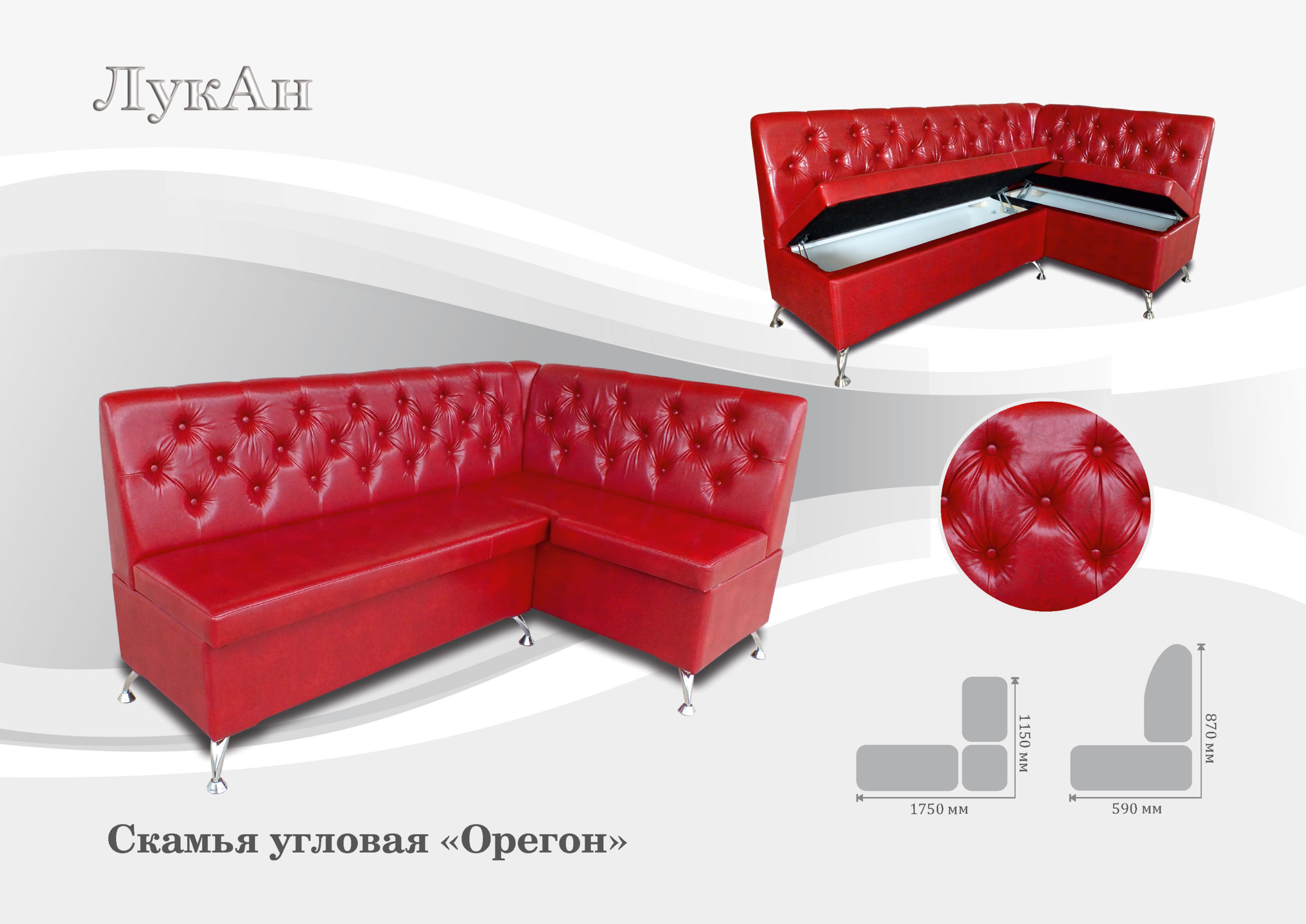 Создать не только практичный, но и уютный дизайн кухни вам поможет кухонный уголок. Для отделки скамьи угловой «Орегон» используются пуговицы. Возможен выбор цвета пуговиц: в цвет обивки или контрастных. Также пуговицы могут быть заменены на стразы . Под сиденьями угловой скамьи «Орегон» предусмотрены зоны для хранения. Возможно изготовление задней стенки скамьи из основного обивочного материала. В стандартном исполнении используется техническая ткань (более бюджетный вариант). Конструктивные особенности угловой скамьи «Орегон» позволяют выпускать скамьи разного размера с возможностью увеличения или уменьшения габаритов шагом в 10 см в любую сторону (в рамках имеющегося размерного ряда). Глубина и высота дивана не меняются. Угловая скамья может быть выполнена в правом или левом исполнении. Данная скамья может сочетаться с комплектами столов, табуретами, банкетками нашего производства. Благодаря современному дизайну и разнообразию обивочного материала наши угловые скамьи станут украшением любого интерьера.